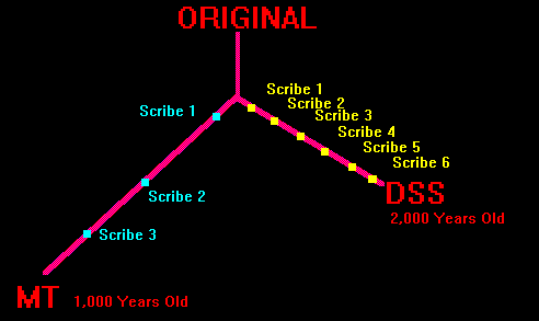 The above illustration shows that an older text is not necessarily closer to the original text. It is possible that a newer text has passed through fewer hands, and is therefore closer to the original. In other words, just because there is a difference in a DSS document does not necessarily mean that the DSS is better.